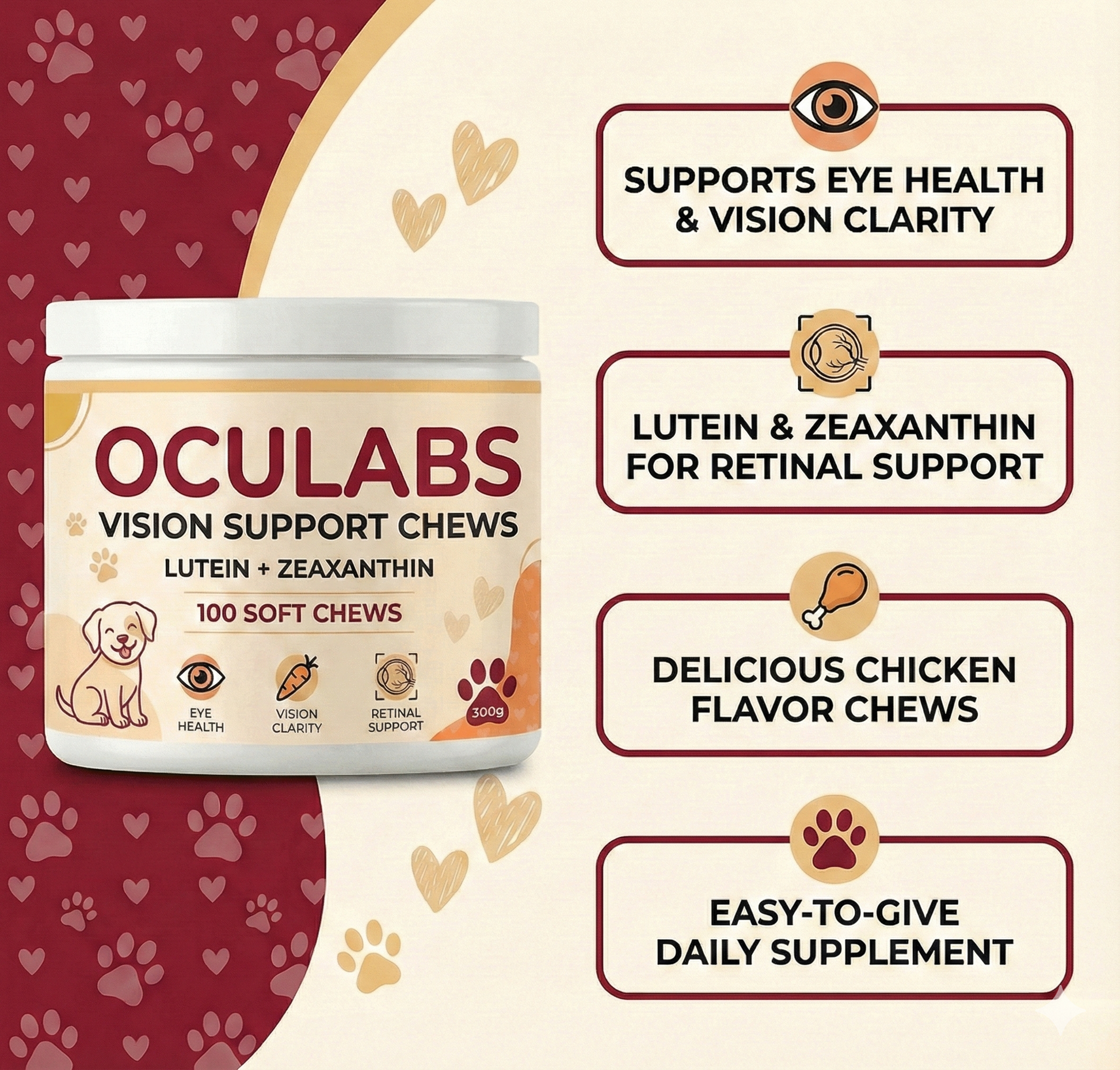 OcuLabs Vision Chews are a veterinary-formulated supplement designed to protect your dog's sight from the inside out. Unlike messy drops, these soft chews are packed with Lutein and Zeaxanthin, which build up in the retina to filter harmful UV light and clear away the "cloudy haze" caused by aging.